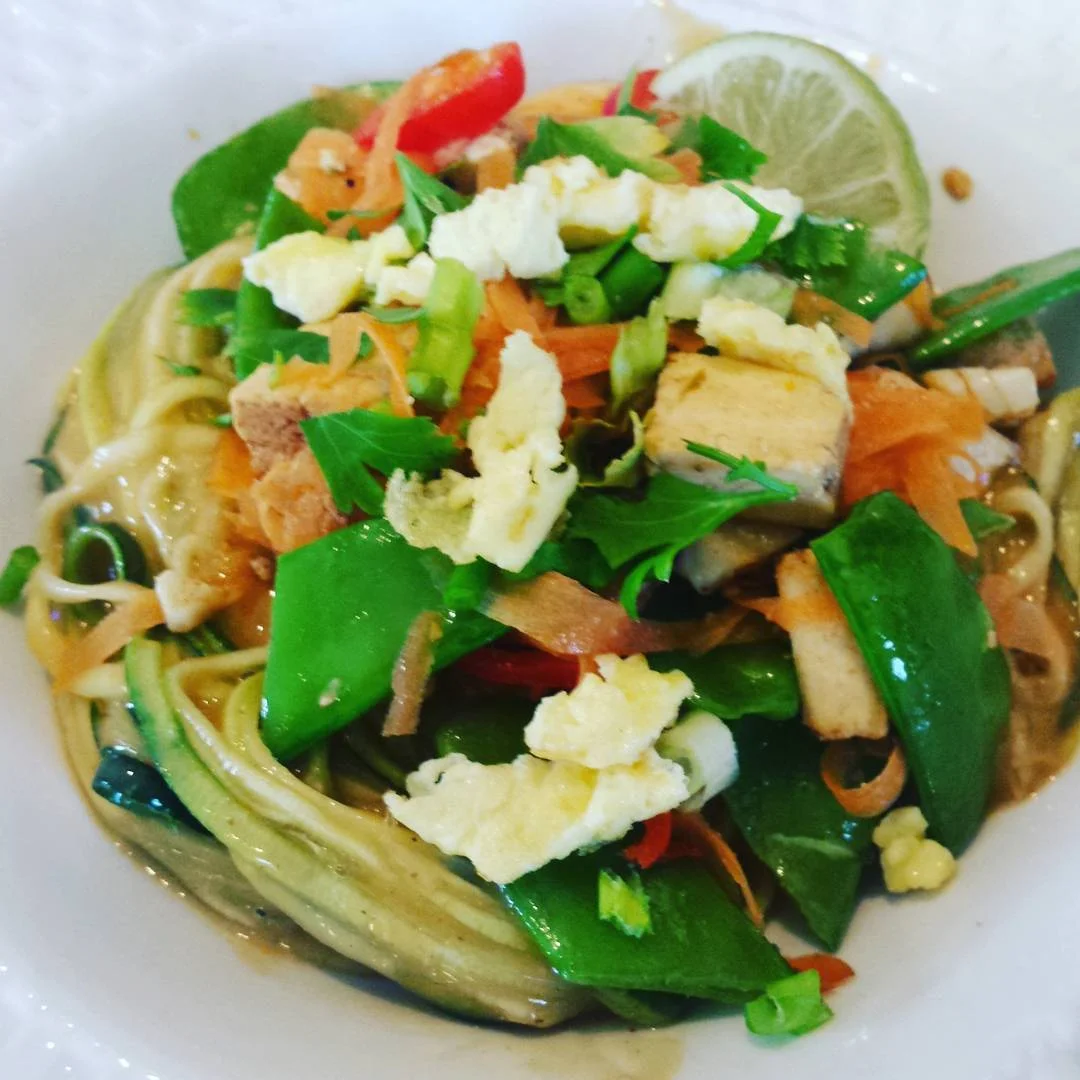 In the same pan, add 1/3 cup peanut butter, 3 tbsp each of brown sugar, soy sauce, ketchup, rice wine vinegar and Sriracha sauce according to your level of spiciness. Add chicken or vegetable stock to thin out the sauce. Add 4 cups of zoodles (zucchini noodles) and toss till covered with sauce.