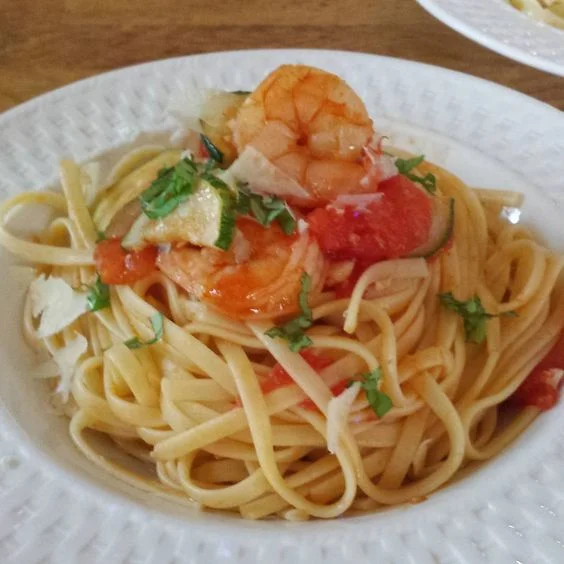 Sautee 2 to 4 tbsp minced garlic in evoo. Add thinly sliced small zucchini and sautee. Add 20 pieces large shelled and deveined shrimp. Cook till both sides are pink. Sprinkle pepperoncino (crushed red pepper flakes). Then add hand crushed plum tomatoes (blanched whole, cored and skin peeled off). Season with s&p. Toss cooked linguini. Serve with fresh chopped basil and shaved parmesan cheese.